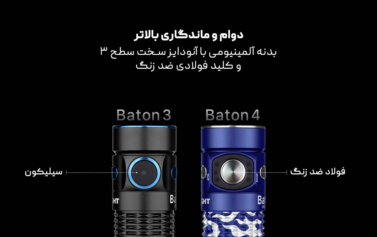 این بدنهی زیبا، ساخته شده از آلیاژ آلومینیوم با کیفیتی است که در صنایع هوافضا کاربرد دارد؛ مادهای بسیار مقاوم که استحکامی مثالزدنی به چراغ قوه میبخشد و حتی قادر است فشارهایی تا حدود یک تن را تحمل کند. چنین دوام و استقامت، باعث میشود Baton 4 در شرایط سخت و چالشبرانگیز، همواره همراه قابل اعتمادی برای شما باشد.