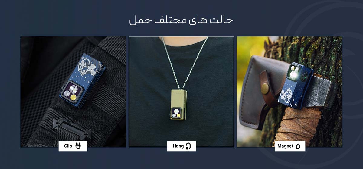 در انتهای گیره (جایی که گیره چراغ قوه را لمس میکند) یک آهنربای کوچک تعبیه شده است که میتوانید محصول را از پشت هم به یک شی فلزی نیز متصل کنید و این دومین روش برای حمل چراغ قوه است. سومین راه و آخرین راه حمل چراغ قوه استفاده از حلقه فلزی یا بند است, در انتهای دیگر گیره (محلی که فشار میدهید) یک سوراخ کوچک برای اتصال بند و یا حلقه جاکلیدی وجوددارد.