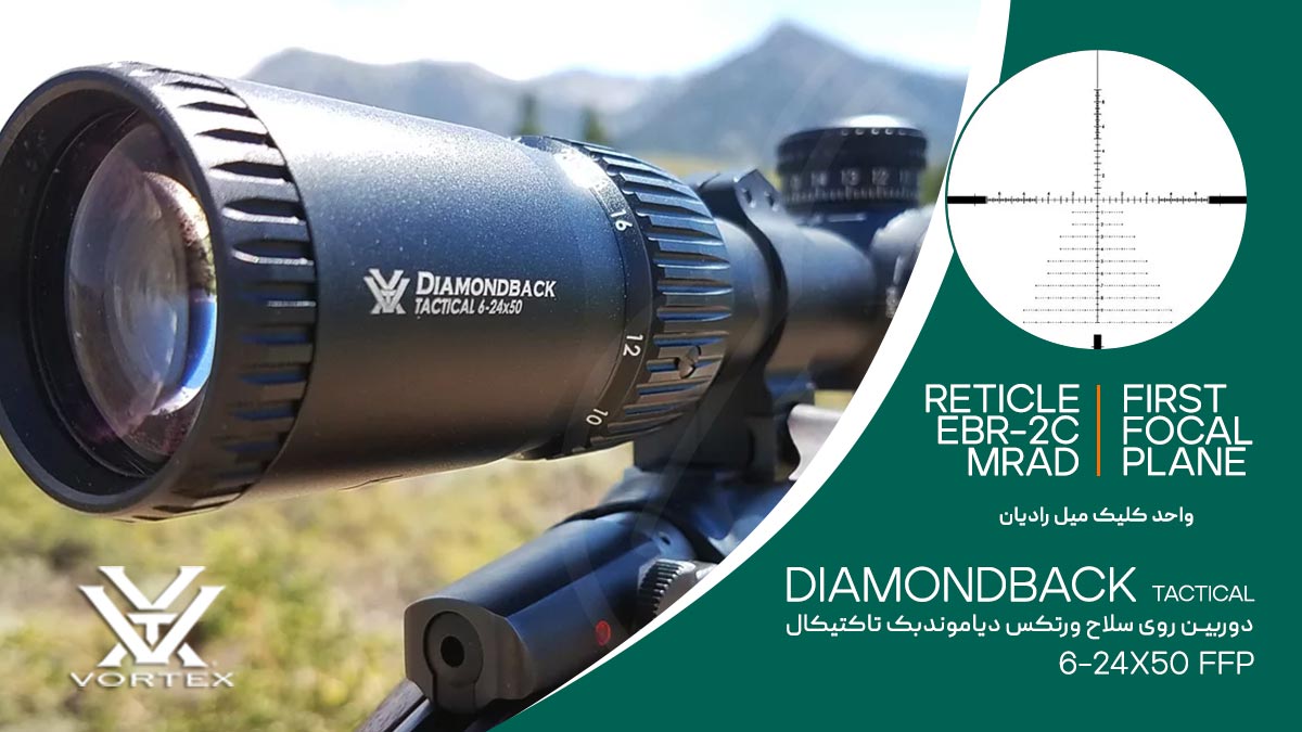 دوربین روی سلاح Vortex Diamondback Tactical 6-24x50 FFP MRAD Reticle EBR-2C #DBK-10029 ترکیبی بی‌نظیر از دقت، دوام و قابلیت‌های پیشرفته است که برای تیراندازان حرفه‌ای و علاقه‌مندان به تیراندازی تاکتیکی طراحی شده است. این دوربین با بزرگنمایی متغیر ۶ تا ۲۴ برابر و قطر لنز ۵۰ میلی‌متر، امکان هدف‌گیری دقیق در فواصل مختلف را به شکلی آسان و کارآمد فراهم می‌کند.