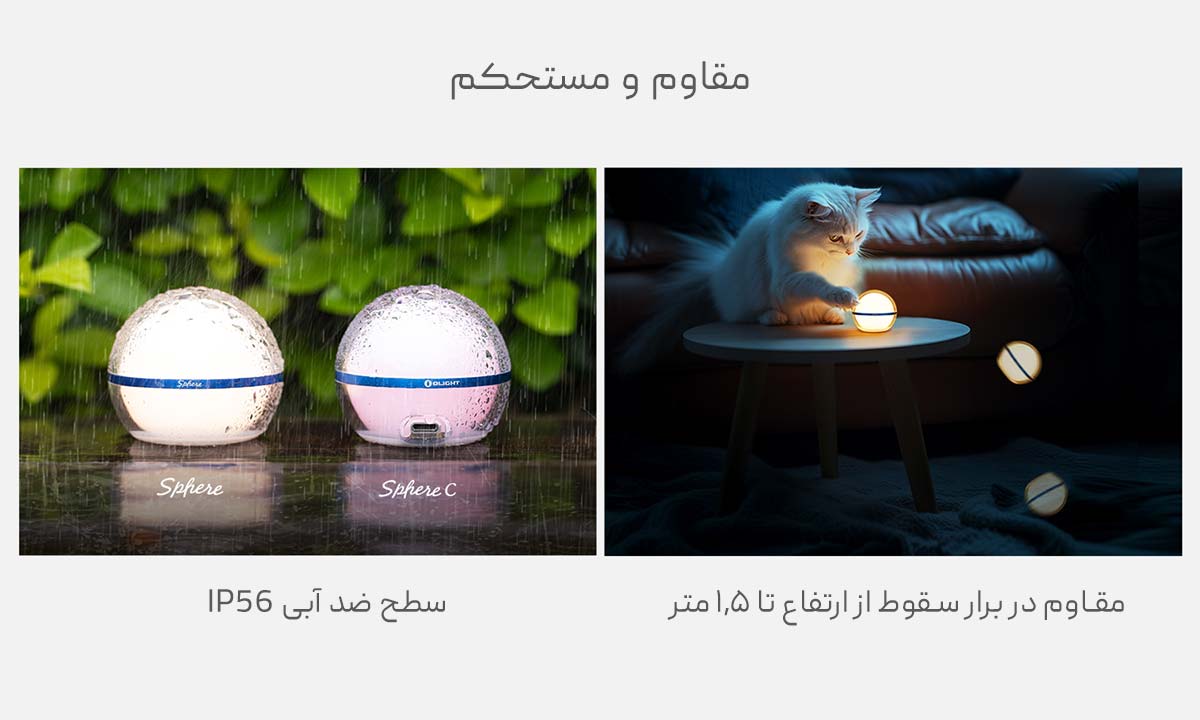 از همه بهتر اینکه Sphere کاملاً هوشمند است و همیشه به شما میگوید چقدر شارژ دارد. هر بار که چراغ را خاموش میکنید، برای یک لحظه کوتاه با رنگی خاص روشن میشود تا وضعیت باتری را بفهمید: اگر سبز شد یعنی شارژ عالی است (بالای ۵۰٪)، اگر زرد شد یعنی زمان شارژ مجدد نزدیک است (بین ۱۰٪ تا ۴۹٪) و اگر قرمز شد یعنی میزان شارژ محصول خیلی کم است (زیر ۱۰٪) و باید سریعاً به برق وصل شود. با این نشانگر، Sphere هیچ وقت شما را غافلگیر نمیکند و همیشه برای روشن کردن لحظات شما آماده است.