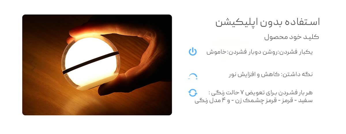 روشنایی شبانه و آسایش: خروجی نور ۱ لومن محصول, نوری ملایم است که به همراه قابلیت تنظیم تایمر خاموش شدن (Countdown Timer) در اپلیکیشن، آن را به یک چراغ خواب ایدهآل تبدیل میکند. علاوه بر آن بدنه محصول داغ نمیشود، بنابراین برای استفاده در اتاق کودکان کاملاً ایمن است.