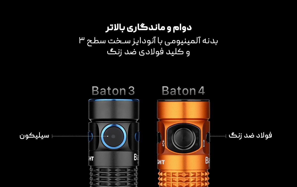 این بدنه‌ی زیبا، ساخته شده از آلیاژ آلومینیوم با کیفیتی است که در صنایع هوافضا کاربرد دارد؛ ماده‌ای بسیار مقاوم که استحکامی مثال‌زدنی به چراغ قوه می‌بخشد و حتی قادر است فشارهایی تا حدود یک تن را تحمل کند. چنین دوام و استقامت، باعث می‌شود Baton 4 در شرایط سخت و چالش‌برانگیز، همواره همراه قابل اعتمادی برای شما باشد.