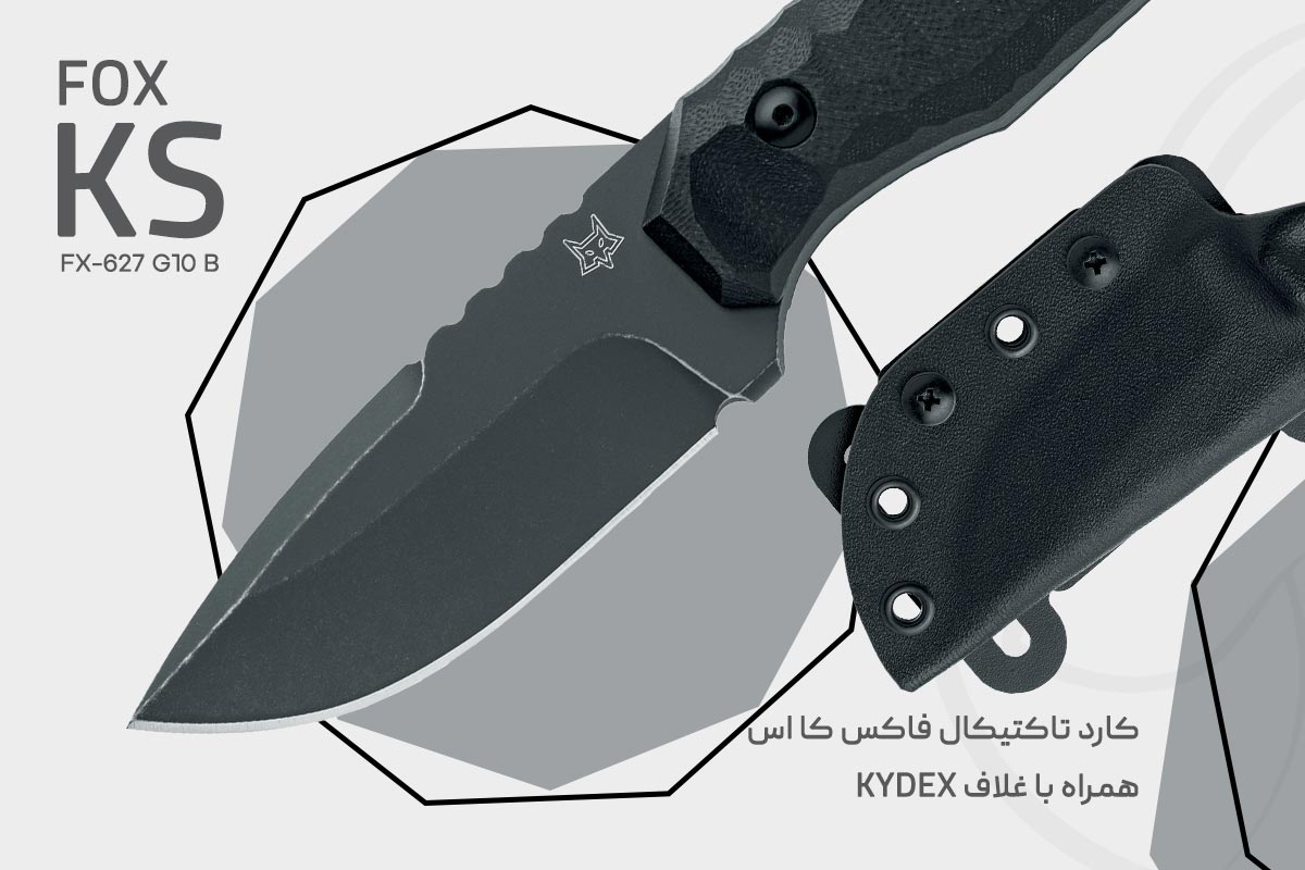 پیچهای اتصال دسته نیز با پوشش اختصاصی شرکت Fox Knives یعنی Coyote Idroglider پوشانده شدهاند تا علاوه بر افزایش مقاومت در برابر خوردگی، هماهنگی رنگی زیبایی با ساختار تیرهی کارد ایجاد کنند. ترکیب رنگ مشکی مات و طراحی ساده اما پرصلابت، به KS چهرهای نظامی، تاکتیکال و جدی بخشیده است.
