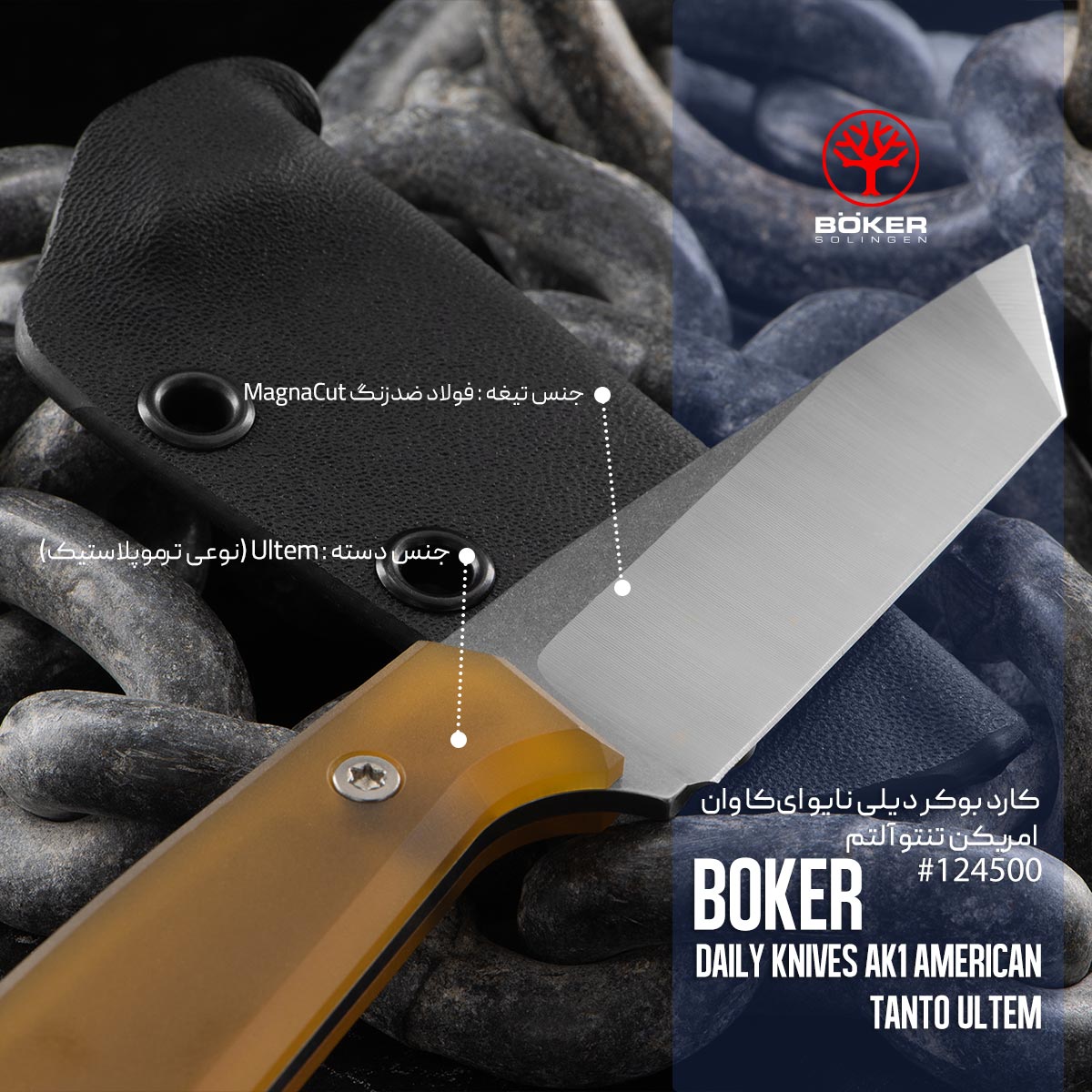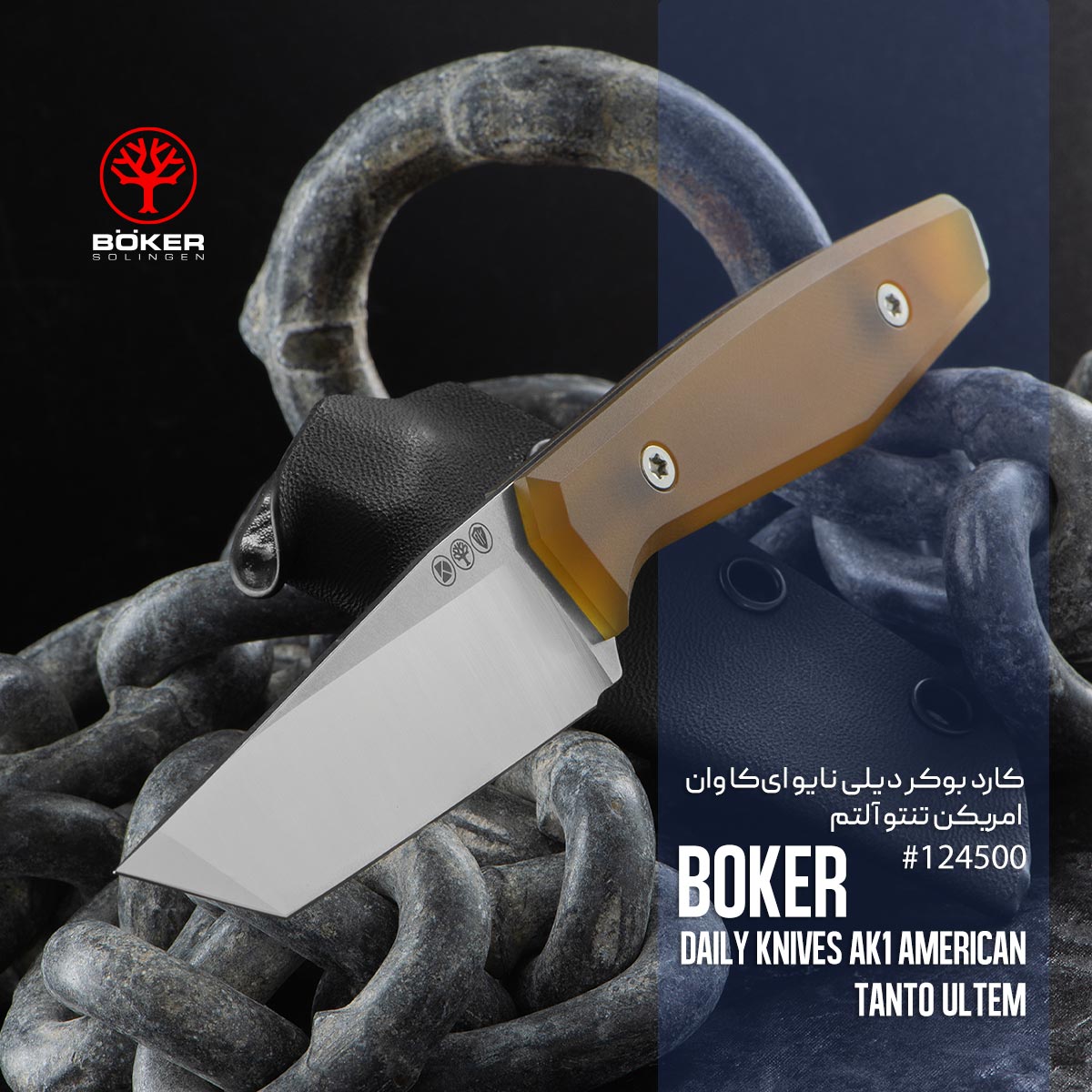 مدل AK1 از سری Daily Knives بوکر، که با همکاری طراح جوان آلمانی آلکس کرمر (Alex Kremer) و شرکت Daily Customs توسعه یافته، به سرعت به یک کارد کاربردی (Fixed Blade) با کاربری روزمره (EDC) تبدیل شده است. مدل American Tanto Ultem یک نسخه برجسته از این سری است که ترکیبی از فولاد پیشرفته و مواد مدرن را در خود جای داده است.