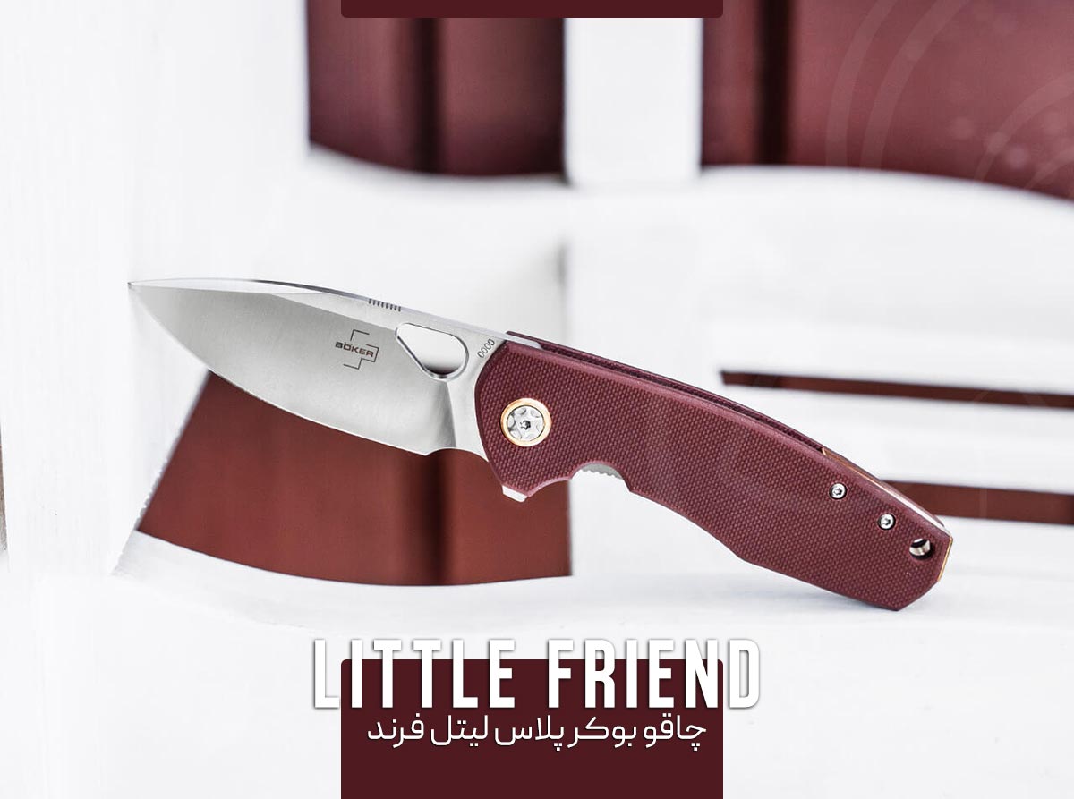 Boker Plus Little Friend دارای ظاهری تاکتیکال-مینیمال است که با رنگ G10 قرمز، ظاهری پویا و با قابلیت دید بالا پیدا کرده است. ابعاد بسیار کوچک آن، امکان حمل آن را در کوچکترین فضاهای جیب یا به عنوان جاسوئیچی (Keyring) فراهم میآورد.