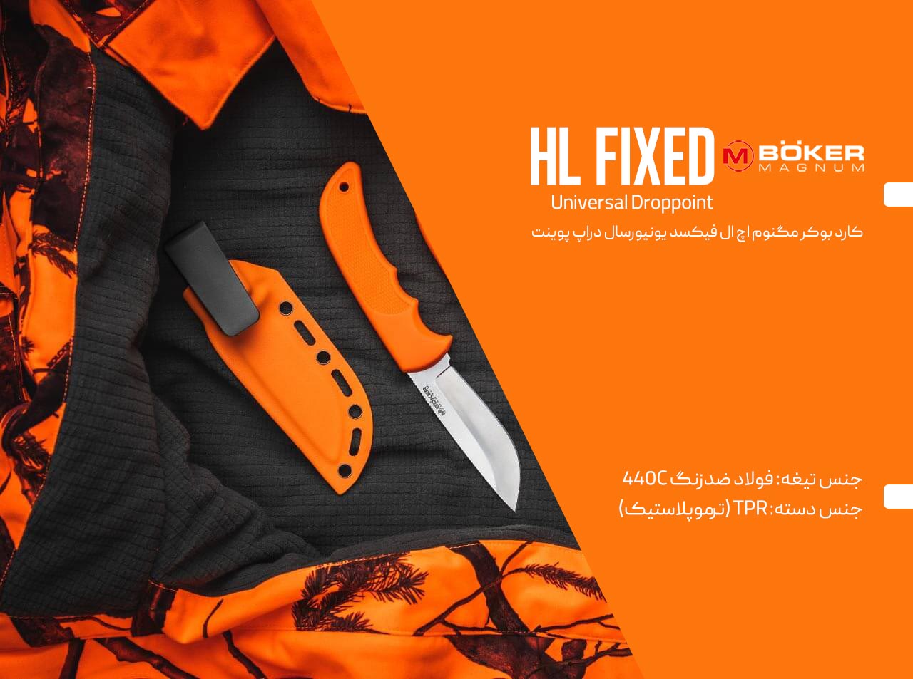 در قلب هر سفر به طبیعت، وجود ابزاری که بدون قید و شرط قابل اعتماد باشد، حیاتی است. چاقوی تیغه ثابت (Fixed Blade) معیار نهایی استحکام است و مدل BOKER MAGNUM HL Fixed Universal Droppoint با کد #02RY800، تجسم سادگی، قدرت و قابلیت همه‌کاره بودن است. این چاقو که از زیرمجموعه مگنوم شرکت آلمانی بوکر (Böker) عرضه می‌شود، با یک طراحی کلاسیک Droppoint (نوک افتاده) و ساختار محکم، به گونه‌ای طراحی شده که بتواند از پس هر وظیفه خارج از منزل، از بوش‌کرفت گرفته تا شکار، برآید. در این مقاله جامع، ما تمام ابعاد این ابزار حیاتی را از جنبه‌های ظاهری و متریال ساخت تا کاربردهای جهانی آن بررسی خواهیم کرد تا خریدار با آگاهی کامل و بدون ابهام، این همراه مطمئن را انتخاب نماید.