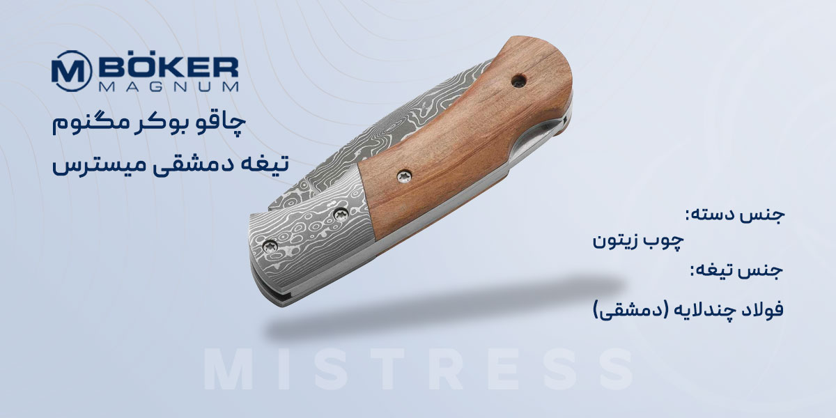 در دنیای ابزارهای برنده، برخی چاقوها با هدف فراتر رفتن از کاربری صرف و دستیابی به جایگاه یک شیء هنری ساخته میشوند. چاقوی Böker Magnum Damast Mistress مدل 01MB171DAM نمونه بارز این فلسفه است. با نامی که تسلط و ظرافت را تداعی میکند، این چاقو با محوریت فولاد دمشقی (Damascus Steel) طراحی شده است، متریالی که از قرون وسطی تاکنون به دلیل زیبایی و استحکام استثناییاش مورد ستایش قرار گرفته است. این محصول، پیوند دهنده مهندسی مدرن آلمانی با هنر باستانی آهنگری است، و برای کسانی که به دنبال یک ابزار EDC (حمل روزمره) لوکس و منحصر به فرد هستند، طراحی شده است.