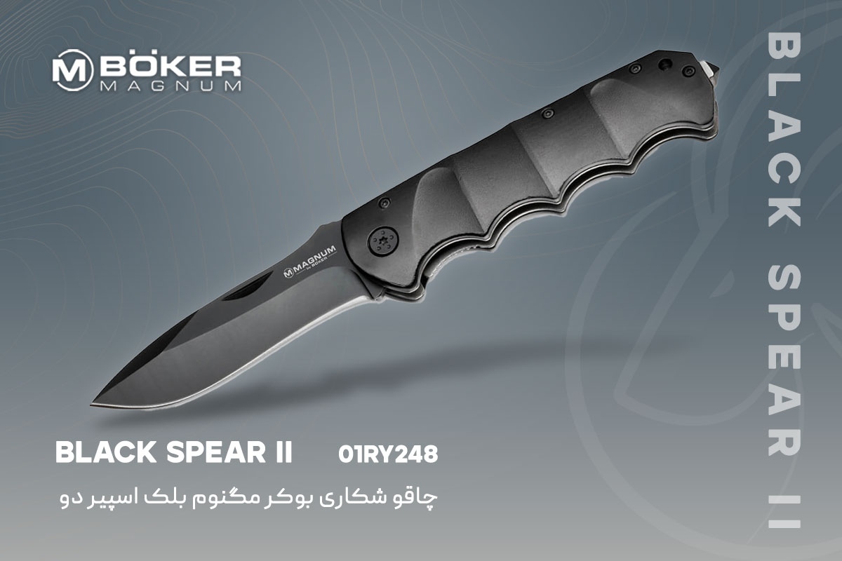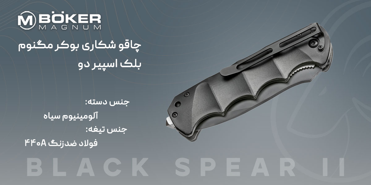 Boker Magnum Black Spear II چاقویی تماما مشکی مانند نیزه ایی سیاه، مستحکم با استایل تاکتیکال و مناسب حمل روزانه (EDC)   تیغه ای حدوداً 10 سانتی از فولاد 440A با روکش سیاه رنگ ساخته شده این فولاد مستحکم به اصطلاح چقرمگی بالایی دارد (Toughness) و در برابر فشار و ضربه بسیار مقاوم است همچنین تیز شدن آسان از نقاط قوت دیگر این فولاد می باشد. دسته این چاقوی 230 گرمی از آلومینیوم با لاینرهای فولادی ساخته شده که بسیار قدرتمند است و جای انگشتان که روی آن طراحی شده آنرا بسیار خوشدست کرده است. تیغه به راحتی با وجود شیار ناخن باز میگردد و توسط ضامن Liner Lock در جای خود قفل میشود.یک کلیپس برای حمل راحت در جیب یا  کوله  روی بدنه تعبیه شده ویک شیشه شکن نیز درانتهای دسته کارایی این چاقو را  به کمال  رسانده.