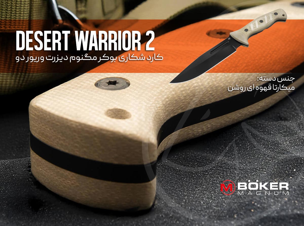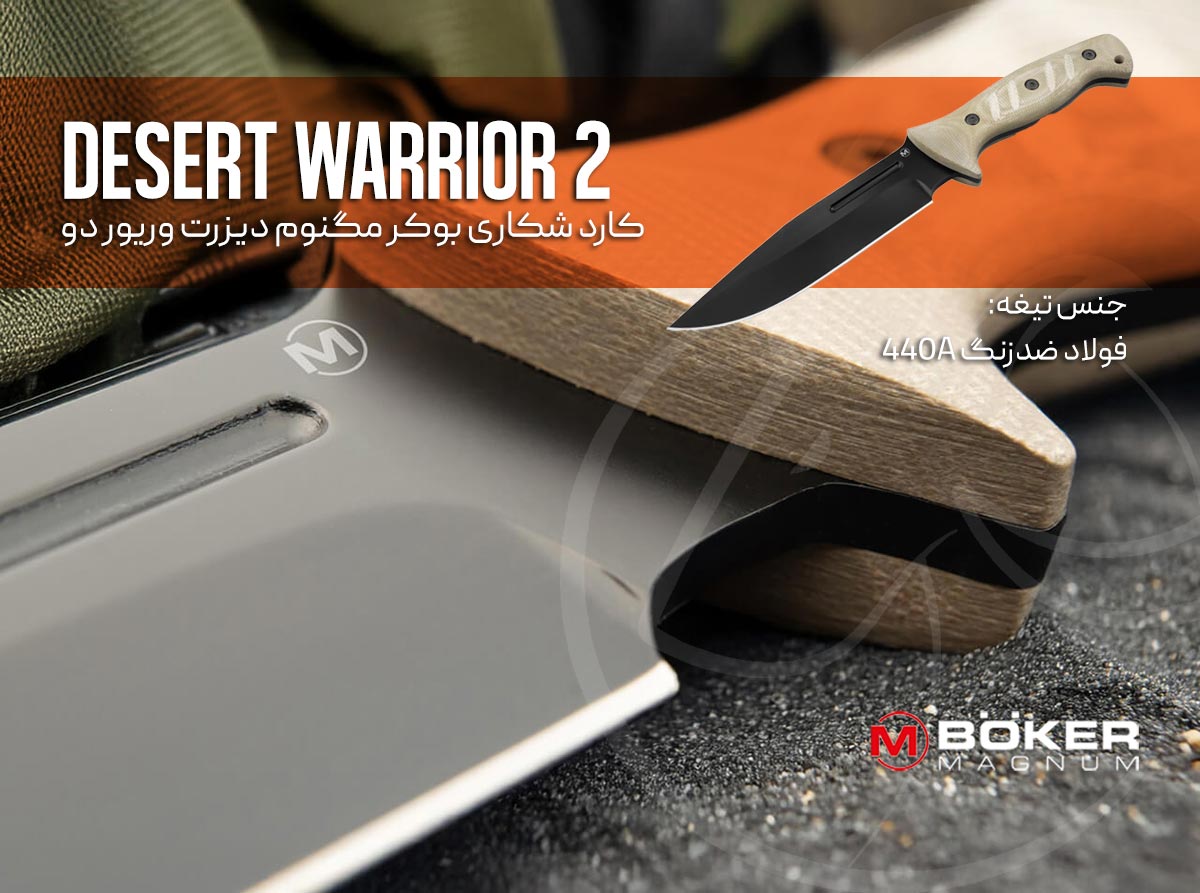 کارد بوکر مدل Desert Warrior 2.0 یک کاردبقا با اندازه بزرگ و قابل اتکا با تیغه 17سانتی است .ازعملیات نجات تا بقا در طبیعت از کمپینگ تا خورد کردن شاخه های کوچک، هیچ کاری برای این کارد غیر ممکن نیست. تیغه یکپارچه (Full Tang) این کارد از فولاد نام آشنای 440A با روکش سیاه رنگ ساخته شده این فولاد مستحکم به اصطلاح چقرمگی بالایی دارد (Toughness) و در برابر فشار و ضربه بسیار مقاوم است همچنین تیز شدن آسان از نقاط قوت دیگر این فولاد می باشد. دسته این کارداز جنس میکارتا است. میکارتا نوعی ماده ترکیبی (Composite) از پارچه و رزین صنعتی است که بسیار مقاوم بوده و چسبندگی خیلی خوبی به دست را فراهم میکند.داشتن یک غلاف ازجنس نایلون که قابلیت اتصال به کمر و بستن به دور پا را دارد حمل این کارد 390 گرمی را بسیار راحت کرده است.