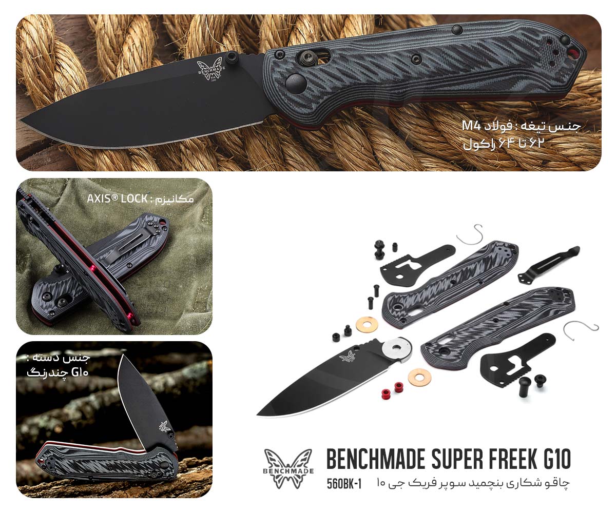 چاقوی بنچمید مدلSuper Freak G10 ترکیب کارایی و زیبایی در یک پکیج ، محصولی که دوماده بسیار مقاوم یعنی G10 و M4 را در کنار هم قرار میدهد، با تیغه ای Drop Point از فولاد M4 High Speed Steel با سختی بی نظیر 62-64 HRC ودسته ایی از جنس G10 مرمری (چند لایه) که جلوه بصری بسیار زیبایی را بعد از ماشین کاری پدید آورده است،همچنین لایه G10 قرمز زیرین و قطعات میانی (Spacer) که به رنگ قرمز آنادایز شده کنتراست بسیار جذابی را پدید آورده است.دارای قفل Axis Lock که ضامن اختصاصی و ثبت شده شرکت بنچمید است و Thumb stud دوطرفه که امکان استفاده با هردو دست را به شما میدهد. پوشش تیره تیغه که مانع از زنگ زدگی این فولاد کربنی میشود به همراه کلیپس تماماً تیره با قابلیت جابجایی، حس تاکتیکال این چاقو را تکمیل میکند.