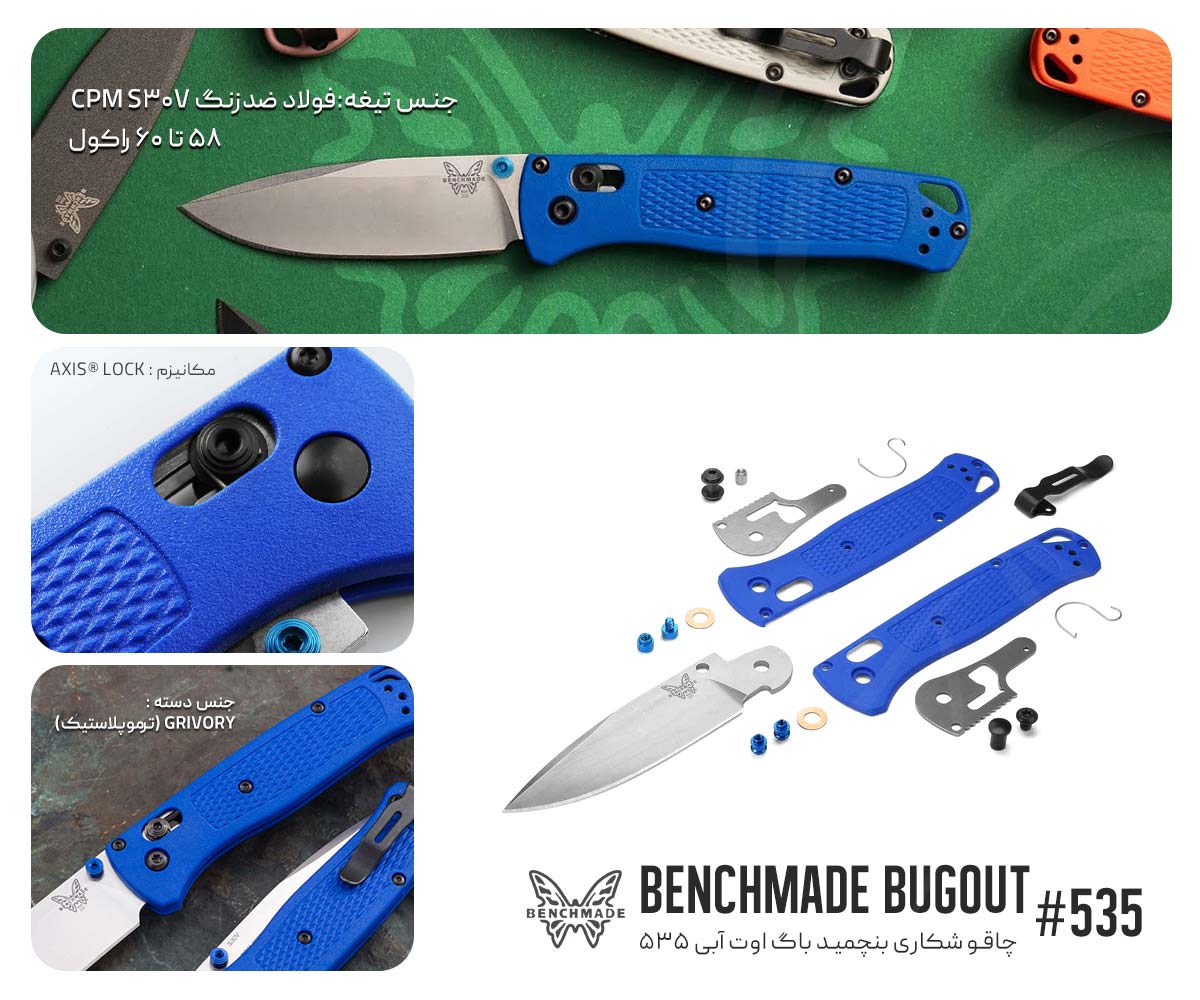 بنچمید مدل Bugout یک چاقوی و خوش استایل و بسیار مناسب برای حمل روزانه است . این مدل را میتوان معروف ترین وپرفروشترین چاقوی بنچمید نامید که در سایز استاندارد به سبکی معروف است، با تیغه ای8.23 سانتی  Drop Point از فولاد به نام و با کیفیت CPM-S30V با سختی 58-60HRC با پرداخت Satin و طول کلی حدود 19 سانت و دسته ای از جنس Grivory این شاهکار تنها 52.45 گرم وزن دارد!