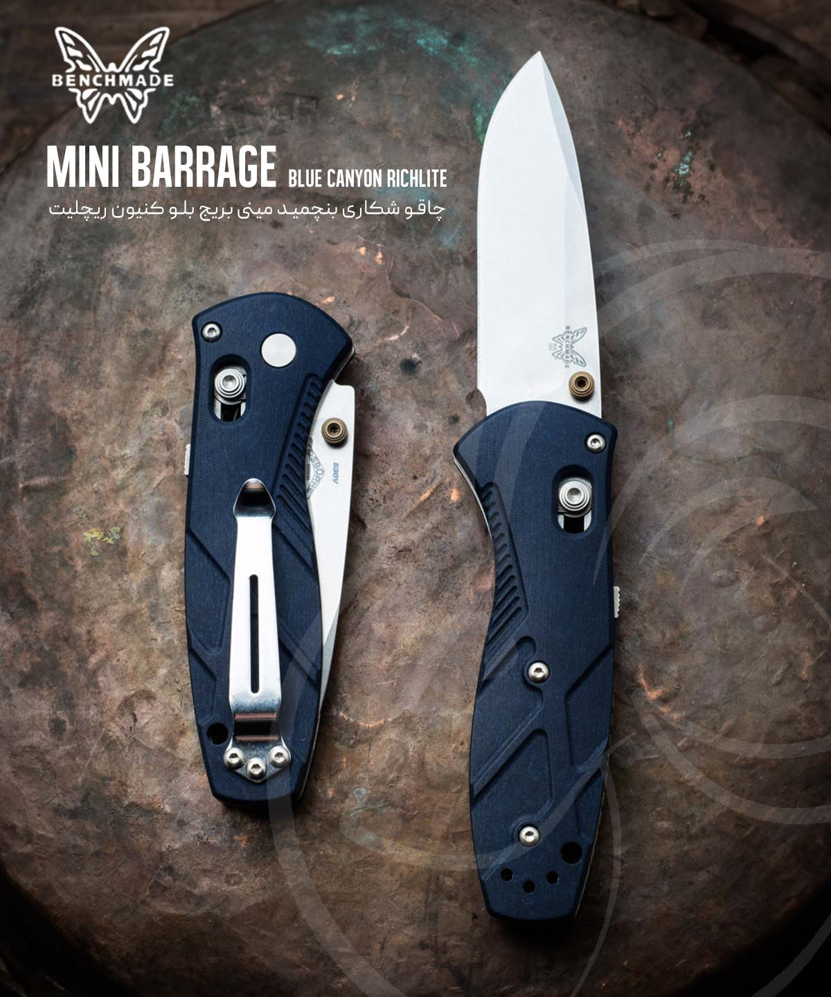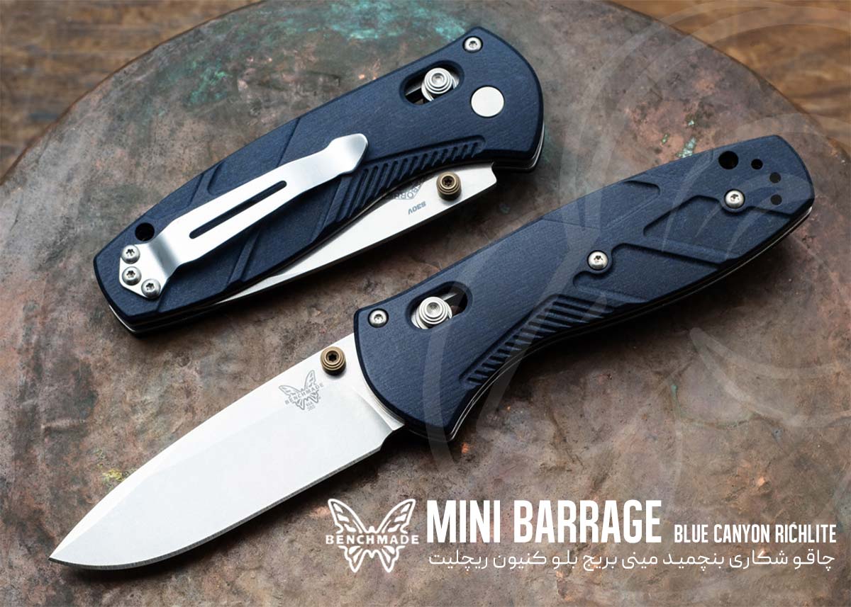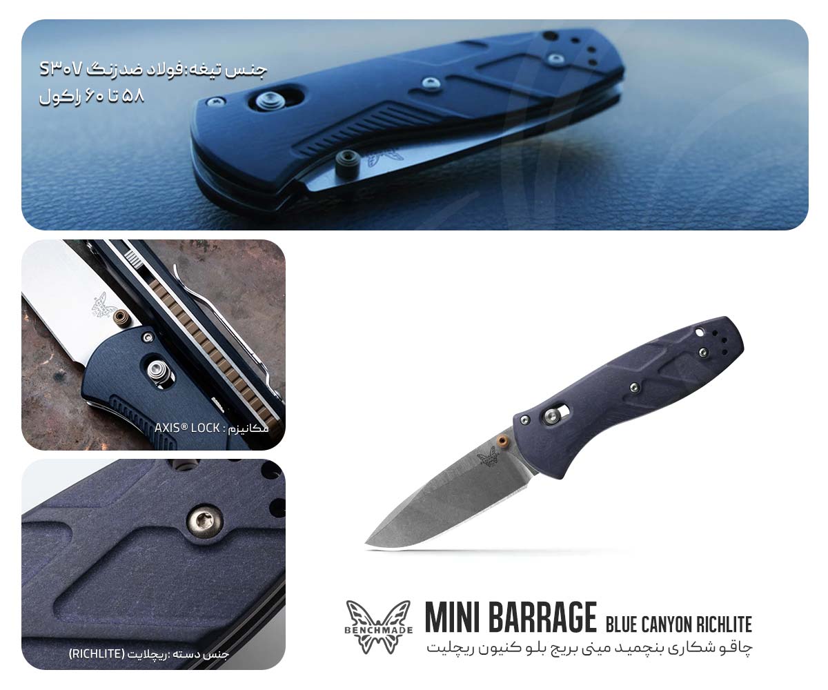 چاقوی بنچمید مدل Mini Barrage Blue Canyon Richlite از طراح بزرگ ونامی Warren Osborne چاقویی تقریبا اتومات که به واسطه داشتن فنر کمکی با لمس Thumb stud با سرعت بسیار بالا باز میشود (Assisted Opening) و برای کشورهایی که ممنوعیت حمل چاقوی اتومات وجود دارد گزینه مناسبی است.پس از باز شده توسط ضامن Axis در جای خود قفل میشود، به دلیل وجود فنرکمکی در این چاقو یک ضامن ثانویه نیز در پشت محصول برای آن در نظر گرفته شده که از باز شدن احتمای چاقو جلوگیری میکند و همچنین اگر در هنگام باز بودن استفاده شود امنیت چاقو را دو برابر میکند.