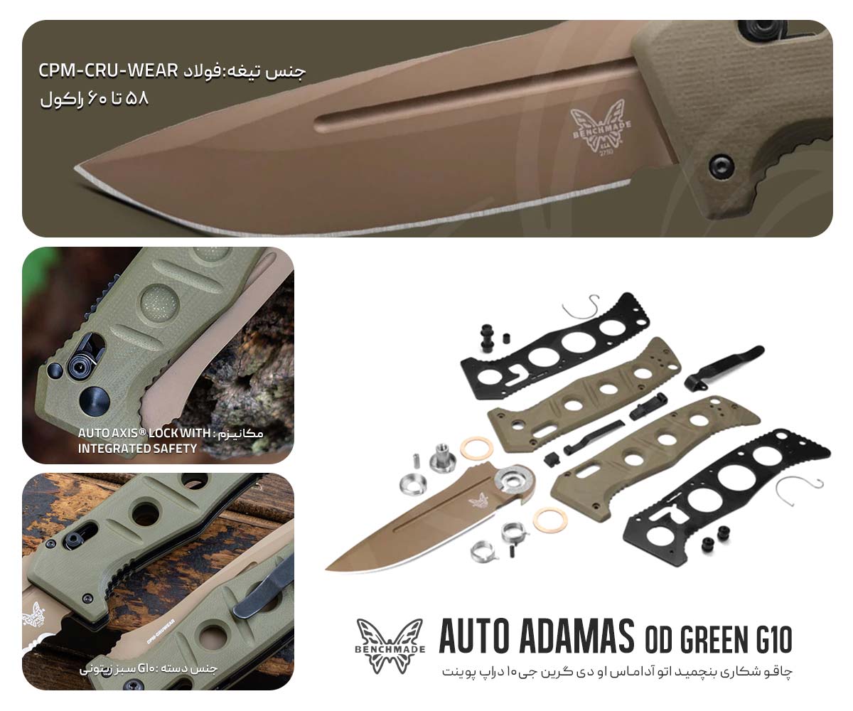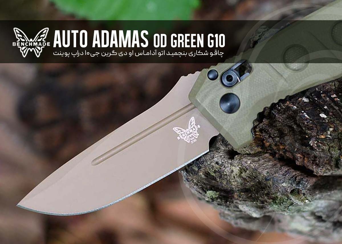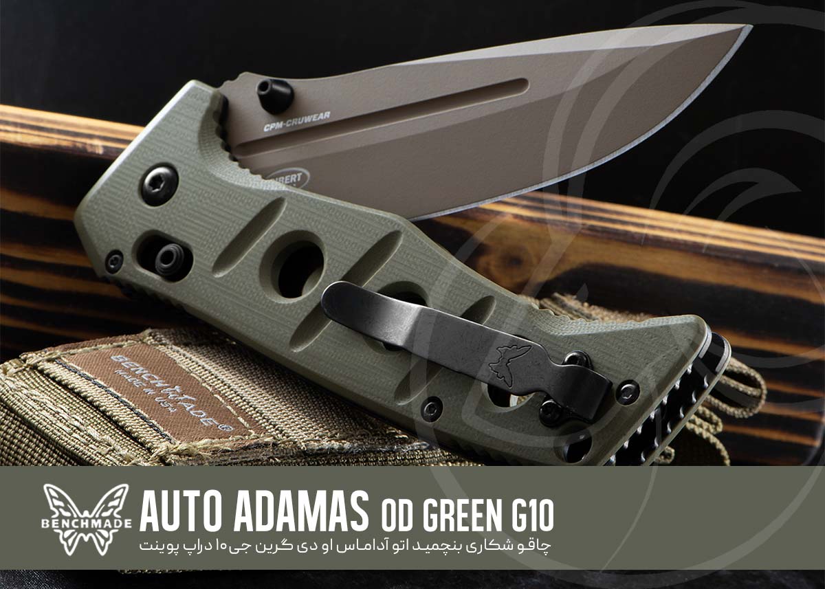 چاقوی Benchmade مدل Auto Adamas OD Green G10 Drop-point همانطور که ازنام این محصول پیداست این، نسخه اتومات چاقوی پر طرفدار Adamas است . طراحی آن به شکلی است که وقتی به آن نگاه میکنید به یاد تانک می افتید، سوراخهایی که روی دسته G10 زیتونی رنگ و لاینرهای فولادی داخلی ایجاد شده به منظور کاهش وزن بدون از بین بردن ابهت این غول 22.6 سانتی بوده،که واقعا هم کارخود را به خوبی انجام میدهند.