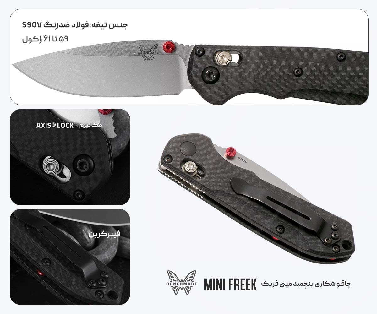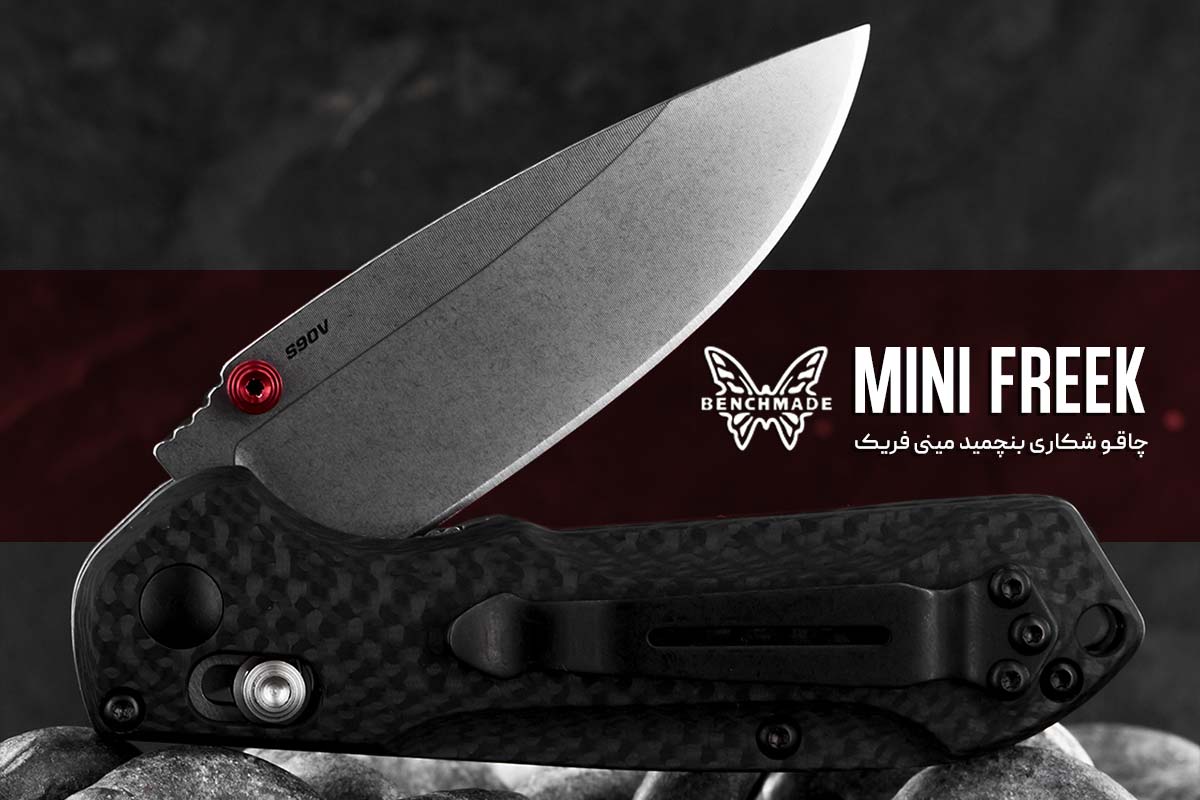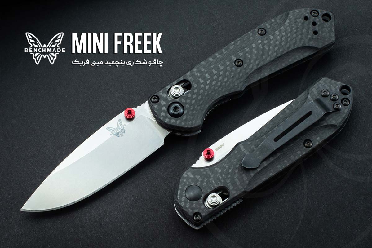 چاقوی بنچمید مدل Mini Freak در حقیقت نسخه جمع و جور مدل Super Freakاست اما با متریال ساخت کاملاً متفاوت.بر خلاف برادر بزرگتر این مدل تیغه ای از فولاد Super Premium Cpm- S90V با سختی 59-61 HRC وپرداخت Satin به همراه دسته ایی از جنس فیبر کربن دارد. دارای قفل فوق ایمن Axis Lock و Thumb stud دوطرفه است که امکان استفاده با هردو دست را به شما میدهد