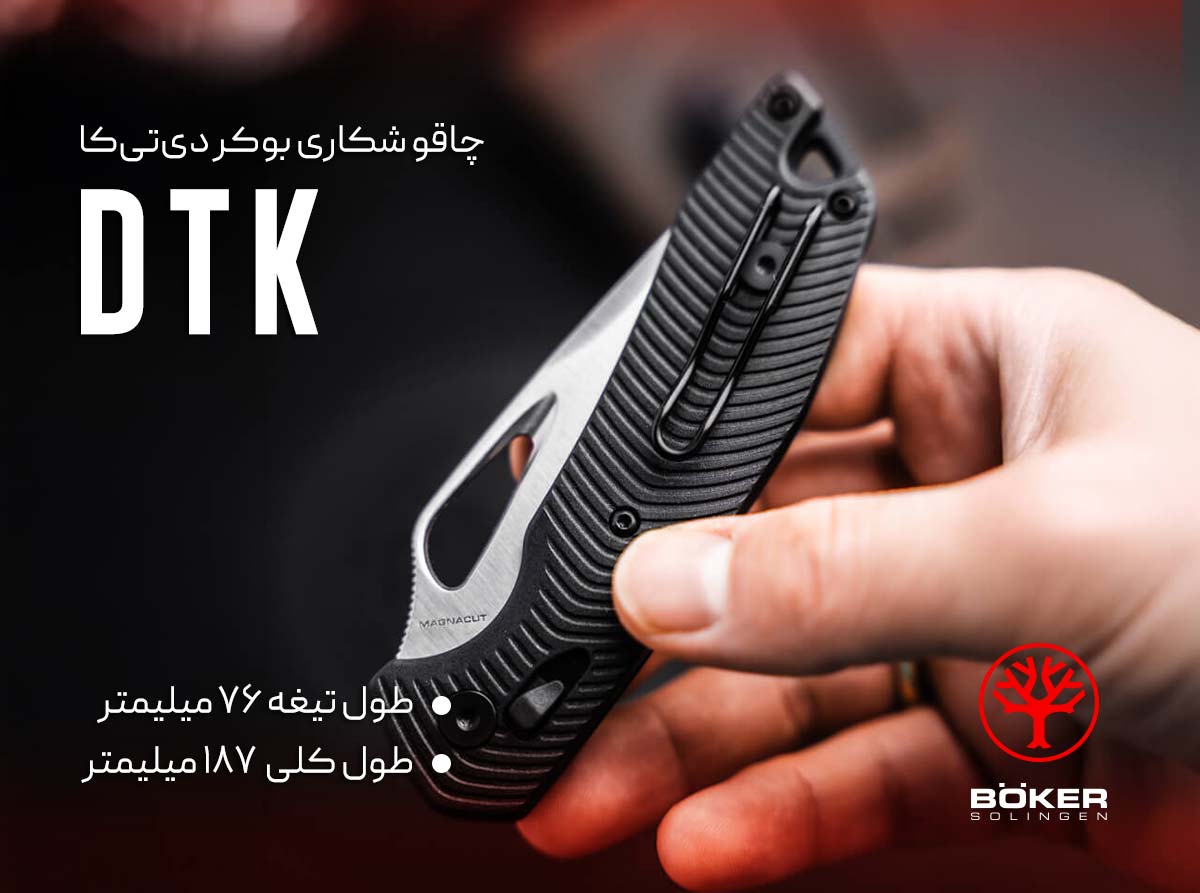 چاقوی BÖKER DTK #110308 یک ابزار آیندهنگر است که با احترام به سنتهای ساخت چاقو در زولینگن آلمان، ساخته شده است. از قدرت انقلابی فولاد MagnaCut و طراحی تانتو قاطع تا ایمنی و سرعت قفل Crossbar، هر المان این چاقو برای عملکرد حداکثری تنظیم شده است.