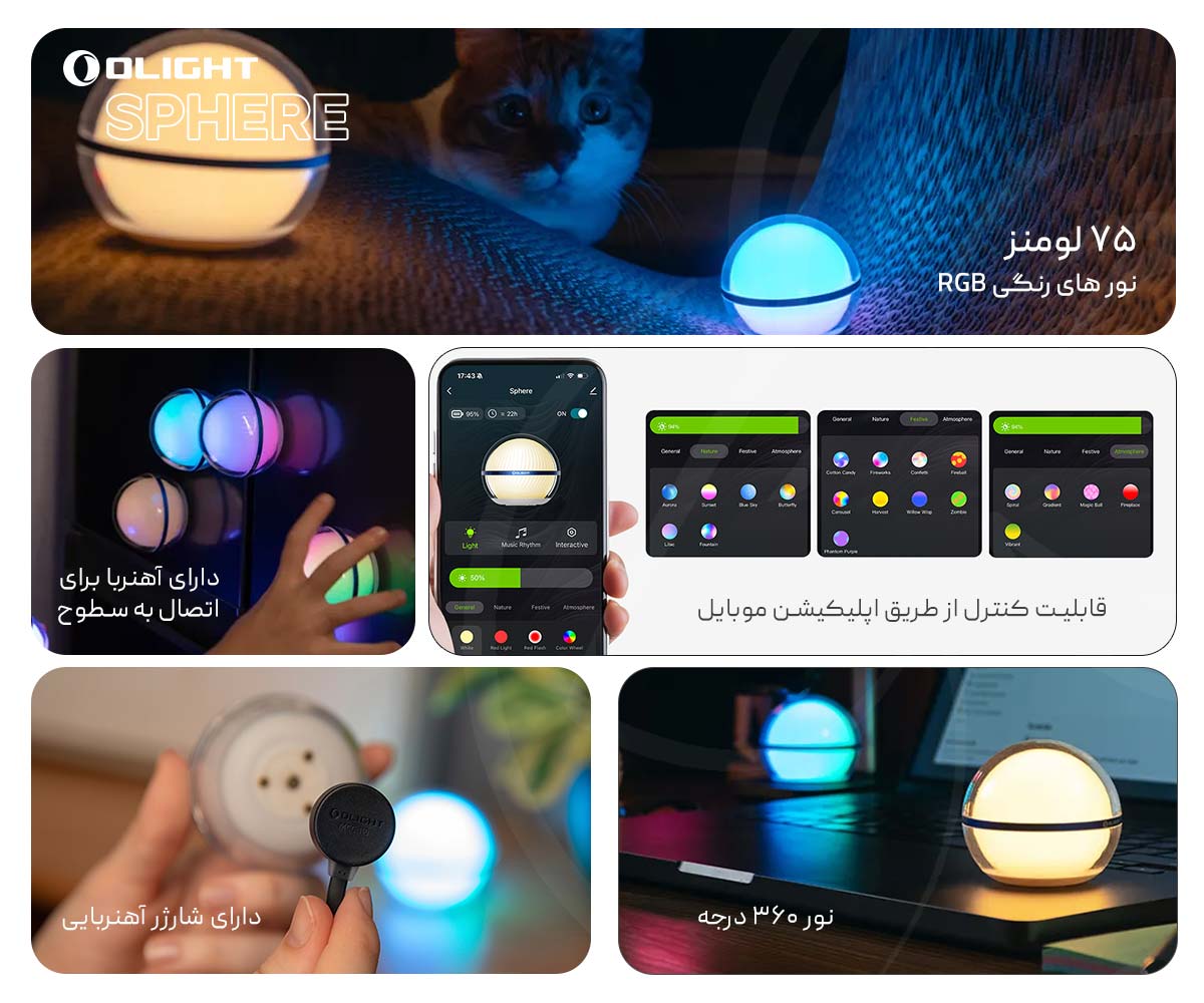 قدرت واقعی Olight Sphere در قابلیتهای هوشمند بودن آن نهفته است. این گوی نورانی از یک چراغ معمولی فراتر رفته و به یک ابزار روشنایی هوشمند تبدیل میشود که کاملاً با گوشی شما هماهنگ است.
