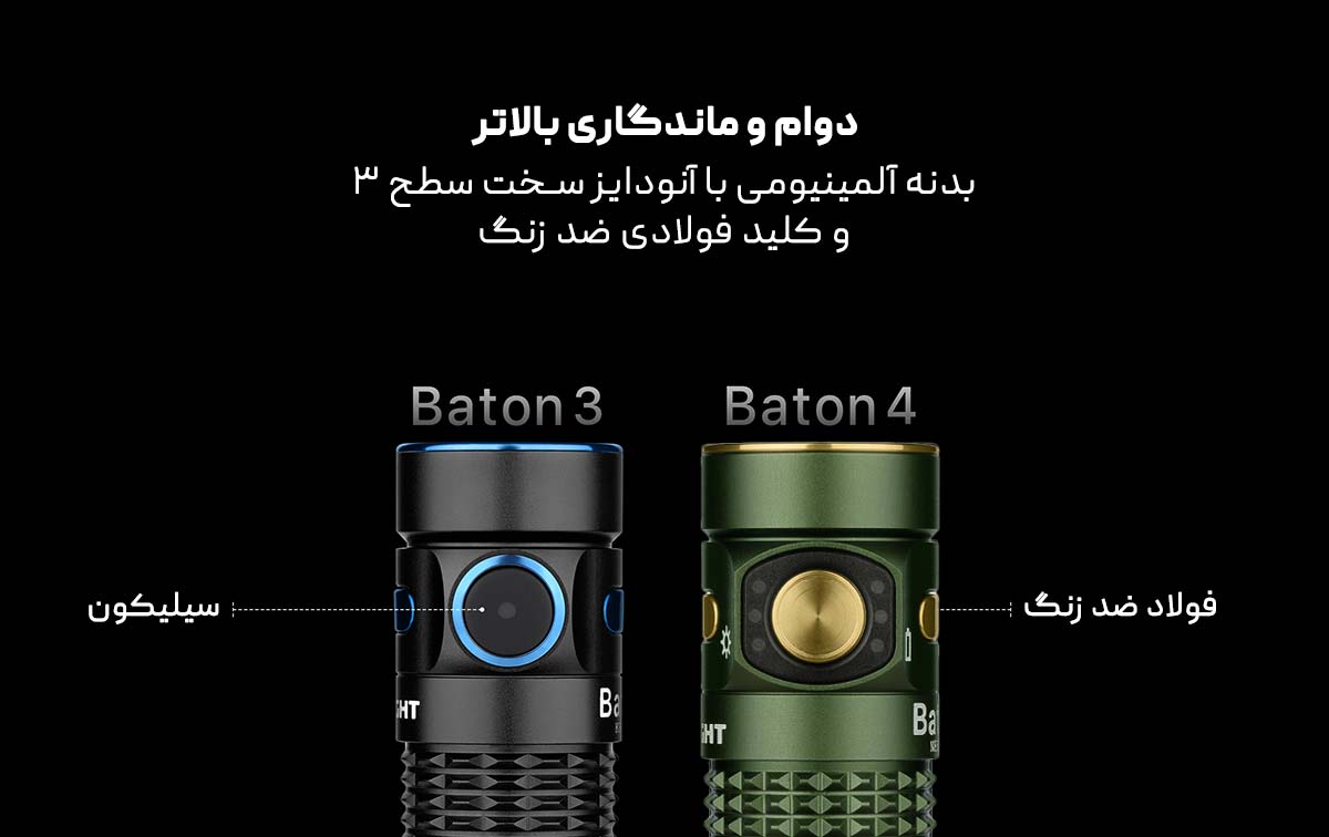این بدنهی زیبا، ساخته شده از آلیاژ آلومینیوم با کیفیتی است که در صنایع هوافضا کاربرد دارد؛ مادهای بسیار مقاوم که استحکامی مثالزدنی به چراغ قوه میبخشد و حتی قادر است فشارهایی تا حدود یک تن را تحمل کند. چنین دوام و استقامت، باعث میشود Baton 4 در شرایط سخت و چالشبرانگیز، همواره همراه قابل اعتمادی برای شما باشد.