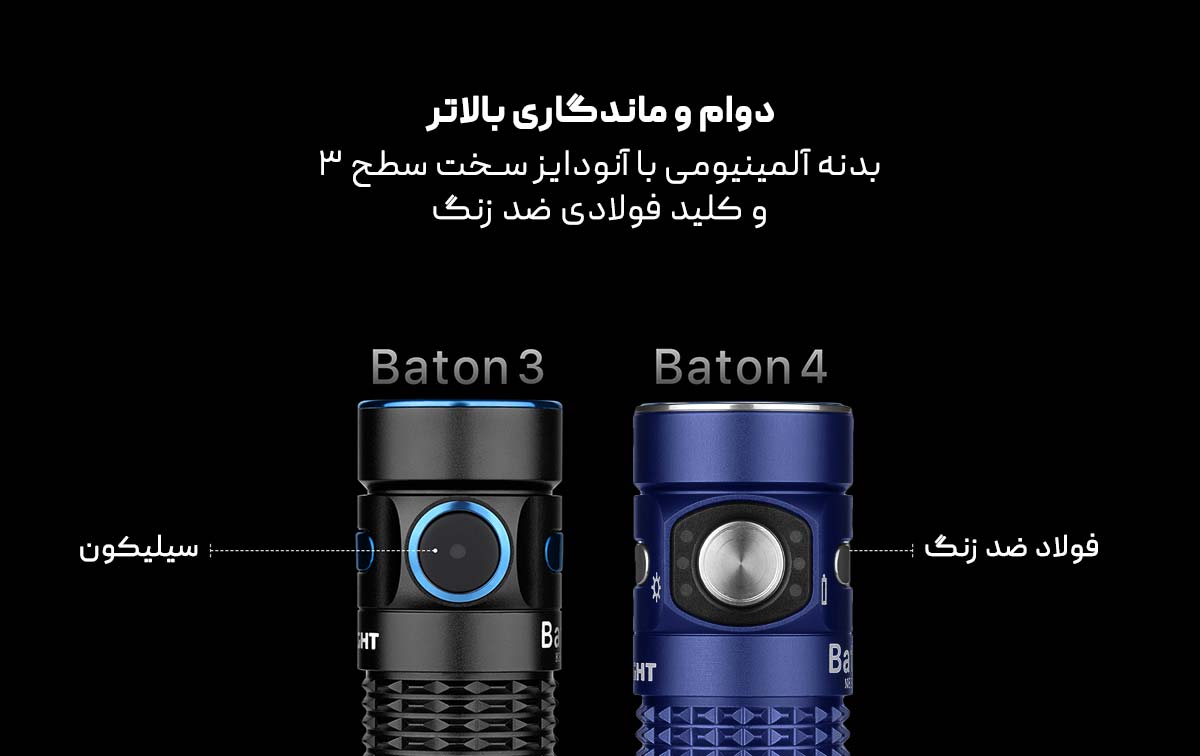 این بدنه‌ی زیبا، ساخته شده از آلیاژ آلومینیوم با کیفیتی است که در صنایع هوافضا کاربرد دارد؛ ماده‌ای بسیار مقاوم که استحکامی مثال‌زدنی به چراغ قوه می‌بخشد و حتی قادر است فشارهایی تا حدود یک تن را تحمل کند. چنین دوام و استقامت، باعث می‌شود Baton 4 در شرایط سخت و چالش‌برانگیز، همواره همراه قابل اعتمادی برای شما باشد.