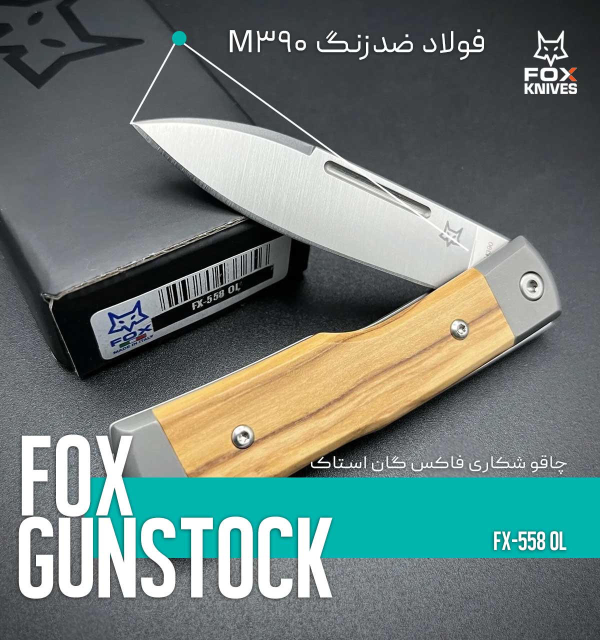 چاقوی فاکس مدل GUNSTOCK با کد فنی FX-558 OL یک چاقوی کاملاً کلاسیک تک تیغه از لحاظ طراحی می باشد .تیغه ای برگ بیدی که برای باز شدن به دو دست نیاز دارد و روی آن یک شیار ناخن بلند ماشین کاری شده است. دسته ای با حالت پله ای و گوشه های نسبتا تیزکه یاد آور روزگار خوش قدیم وچاقو های پدربزرگهاست این چاقو حتی ضامنی برای نگهداری تیغه ندارد و از سیستم (Slipjoint) برای ثابت کردن تیغه استفاده میکند. اما همه چیز در این چاقوقدیمی نیست! جدای از بحث طراحی از به روز ترین و برترین مواد اولیه در ساخت آن استفاده شده تیغه از یکی از بهترین فولادهای اروپایی یعنی M390 و دسته از تیتانیوم به همراه چوب بسیار دلنواز زیتون ساخته شده یک غلاف چرمی هم به همراه این چاقو تقدیمتان میشود تا دغدغه ای برای حمل آن نداشته باشید. ترکیب طراحی نوستالژیک با مواد روز این چاقو را به یکی از خواستنی ترین مدلها برای تمامی نسلها بدل کرده است که در ادامه به بررسی دقیق تر این محصول میپردازیم.