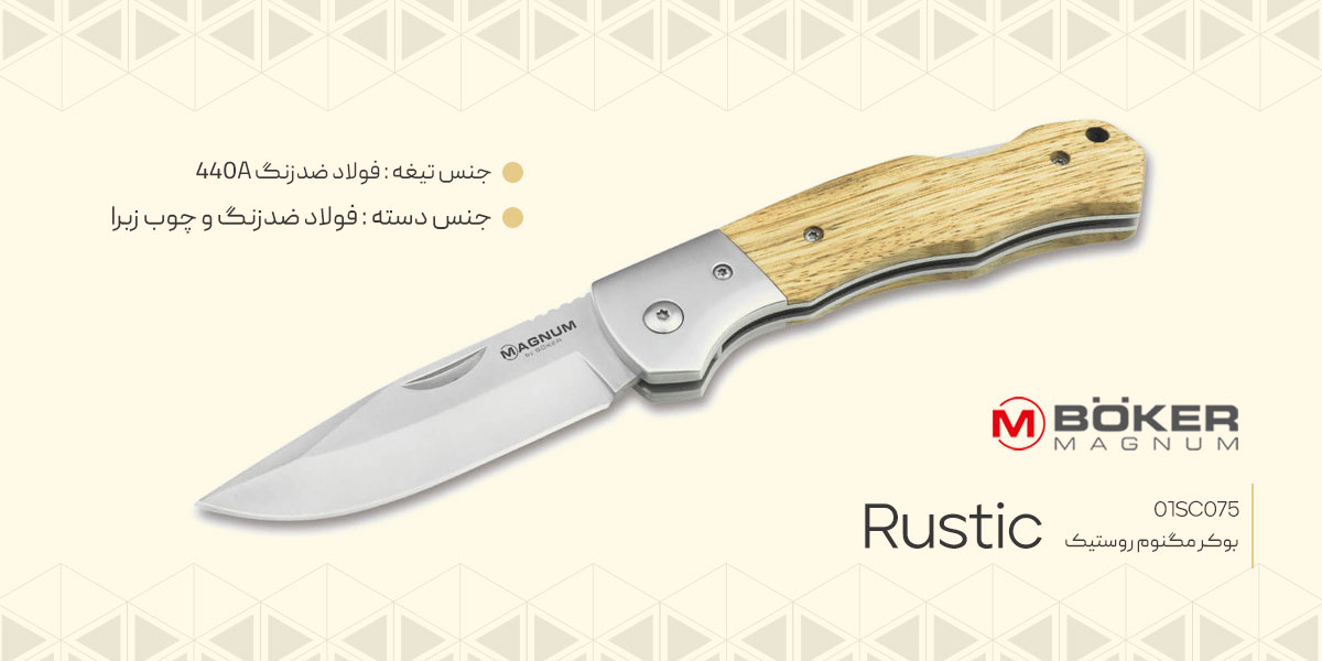 در عصری که طراحی‌های تاکتیکال و مدرن بر بازار ابزارهای EDC (حمل روزمره) تسلط دارند، مدل‌هایی که به زیبایی و سادگی سنت وفادار می‌مانند، جذابیت خاصی پیدا می‌کنند. چاقوی BOKER MAGNUM Rustic با کد #01SC075 دقیقاً چنین ابزاری است. این چاقوی تاشو، که از زیرمجموعه مگنوم شرکت آلمانی بوکر (Böker) عرضه می‌شود، با تأکید بر متریال‌های طبیعی و طراحی بی‌تکلف، حسی از گرما و اصالت را به کاربر منتقل می‌کند، در حالی که از قابلیت‌های فنی یک چاقوی مدرن بهره‌مند است. در این مقاله توصیفی و جامع، به بررسی دقیق ظاهر، مشخصات فنی، و کاربردهای این همراه کلاسیک خواهیم پرداخت تا هیچ ابهامی برای خرید یک چاقوی قابل اعتماد با ظاهری سنتی باقی نماند.