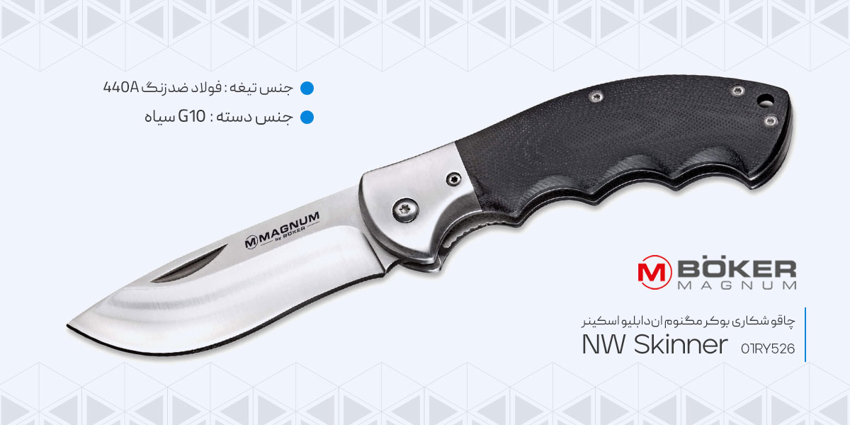 در میان انواع چاقوهای ثابت، برخی مدلها به طور خاص برای انجام یک وظیفه خاص با بالاترین سطح کارایی و ایمنی طراحی شدهاند. چاقوی BOKER MAGNUM NW Skinner با کد #01RY526، همانطور که از نامش پیداست، یک ابزار تخصصی پوستکنی است که برای استفاده توسط شکارچیان، طبیعتگردان و هر کسی که به یک ابزار دقیق برای کارهای میدانی نیاز دارد، طراحی شده است. این چاقو که از زیرمجموعه مگنوم شرکت معتبر آلمانی بوکر (Böker) عرضه میشود، استحکام ساختاری را با ارگونومی و هندسهی تیغهی کاملاً تخصصی ترکیب کرده است. در این مقاله جامع، به طور توصیفی و یکپارچه، تمامی جزئیات ظاهری، مشخصات متریال، و کاربردهای عملی این ابزار تخصصی را بررسی خواهیم کرد تا هیچ ابهامی در مورد توانایی آن برای خریدار باقی نماند.