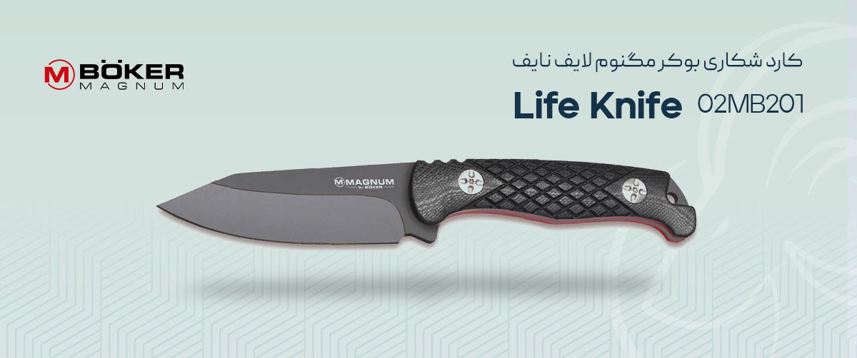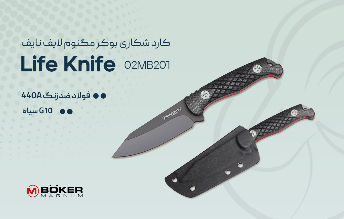 کارد بوکر مگنوم 02MB201 Life Knife یا همان کارد زندگی یک کارد Full Tang از فولاد 440A است این بدان معناست که تیغه و دسته به صورت یکپارچه از یک قطعه فولاد ساخته شده تا بالاترین قدرت و مقاومت را در برابر هرنوع فشاری داشته باشد. فولاد 440A یک فولاد ضد زنگ میان رده با سختی خوب است ، و بزرگترین مزیت آن این است که خیلی راحت تیز میشود. دسته این کارد از G10 مشکی با لاینرهای نارنجی ساخته شده که بسیار مستحکم است .این محصول به عنوان نهایت یک کارد برای فضای بیرون و طبیعت طراحی گردیده جایی که زندگی شما به همراه داشتن آن بستگی کامل دارد.کوهنوردی،طبیعت گردی،کمپینگ یا حتی حمل روزمره (EDC) این مدل از پس هر کاری بر میاید.شاید نتوان گفت که این آخرین کاردی است که میخرید اما در این رده قیمتی قطعا بهترین است. این محصول به همراه یک غلاف تاکتیتال از جنس Kydex تقدیم حضورتان میگردد.