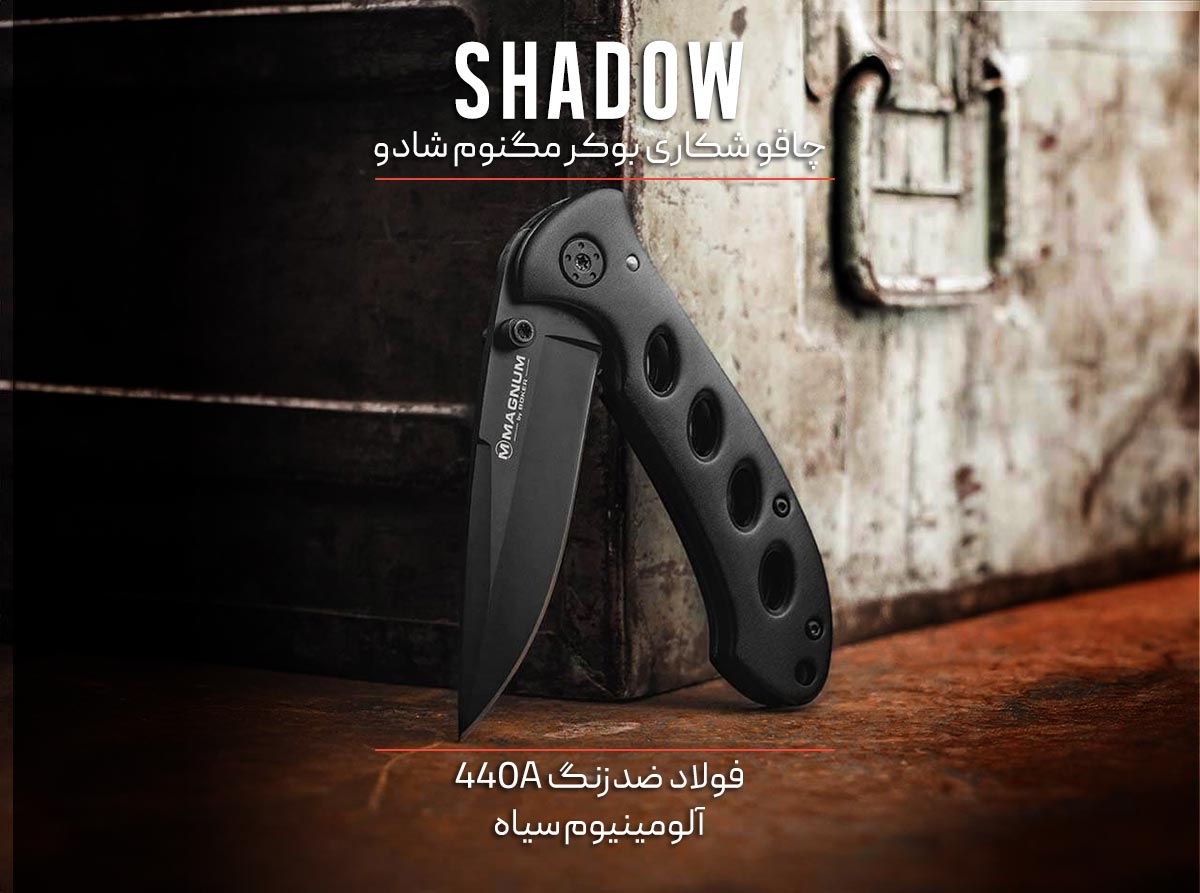 Boker Magnum Shadow چاقویی تماما مشکی مثل سایه ای در تاریکی، سبک با استایل تاکتیکال و مناسب حمل روزانه (EDC) تیغه 8.3 سانتی از فولاد 440A با روکش سیاه رنگ ساخته شده این فولاد مستحکم به اصطلاح چقرمگی بالایی دارد (Toughness) و در برابر فشار و ضربه بسیار مقاوم است همچنین تیز شدن آسان از نقاط قوت دیگر این فولاد می باشد. دسته این چاقوی 85 گرمی از آلومینیوم ساخته شده که غیر از سبکی این متریال طراحی سوراخداراین دسته باعث رسیدن به این وزن مطلوب گردیده. تیغه به راحتی با وجود Thumb Stud با یک دست باز میگردد و توسط ضامن Liner Lock در جای خود قفل میشود.یک کلیپس برای حمل راحت در جیب یا کوله نیز روی بدنه تعبیه شده.