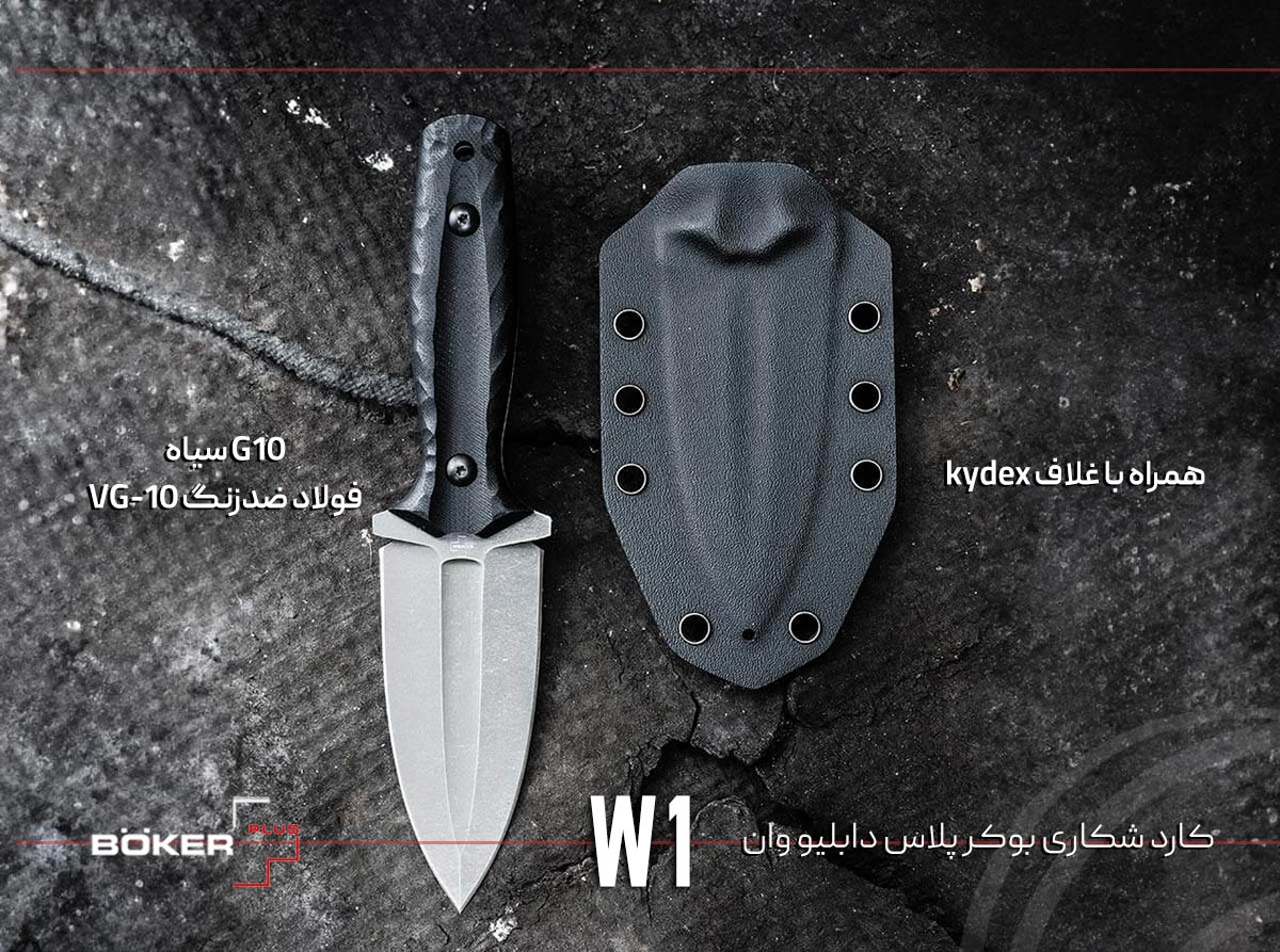 غلاف (Sheath): از آنجایی که W1 یک چاقوی ثابت است، همیشه با یک غلاف (معمولاً از جنس کایدکس (Kydex) یا چرم محکم) عرضه میشود تا حمل ایمن و آسان آن را تضمین کند.
