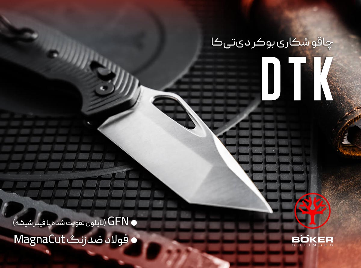 چاقوی BÖKER DTK #110308 یک ابزار آیندهنگر است که با احترام به سنتهای ساخت چاقو در زولینگن آلمان، ساخته شده است. از قدرت انقلابی فولاد MagnaCut و طراحی تانتو قاطع تا ایمنی و سرعت قفل Crossbar، هر المان این چاقو برای عملکرد حداکثری تنظیم شده است.
